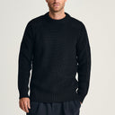 | DESIGN | Robust cardigan med reference til 1970’ernes danske Civilforsvarsstrik. Teknisk indstrikket skulder- og albueforstærkning. Tung men raffineret med præget signaturknapper og indstrikket forlomme. |