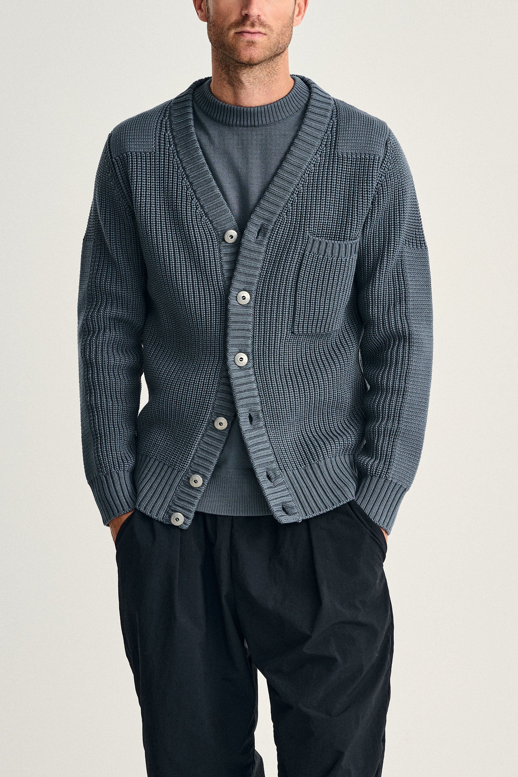 | DESIGN | Robust cardigan med reference til 1970’ernes danske Civilforsvarsstrik. Teknisk indstrikket skulder- og albueforstærkning. Tung men raffineret med præget signaturknapper og indstrikket forlomme. |