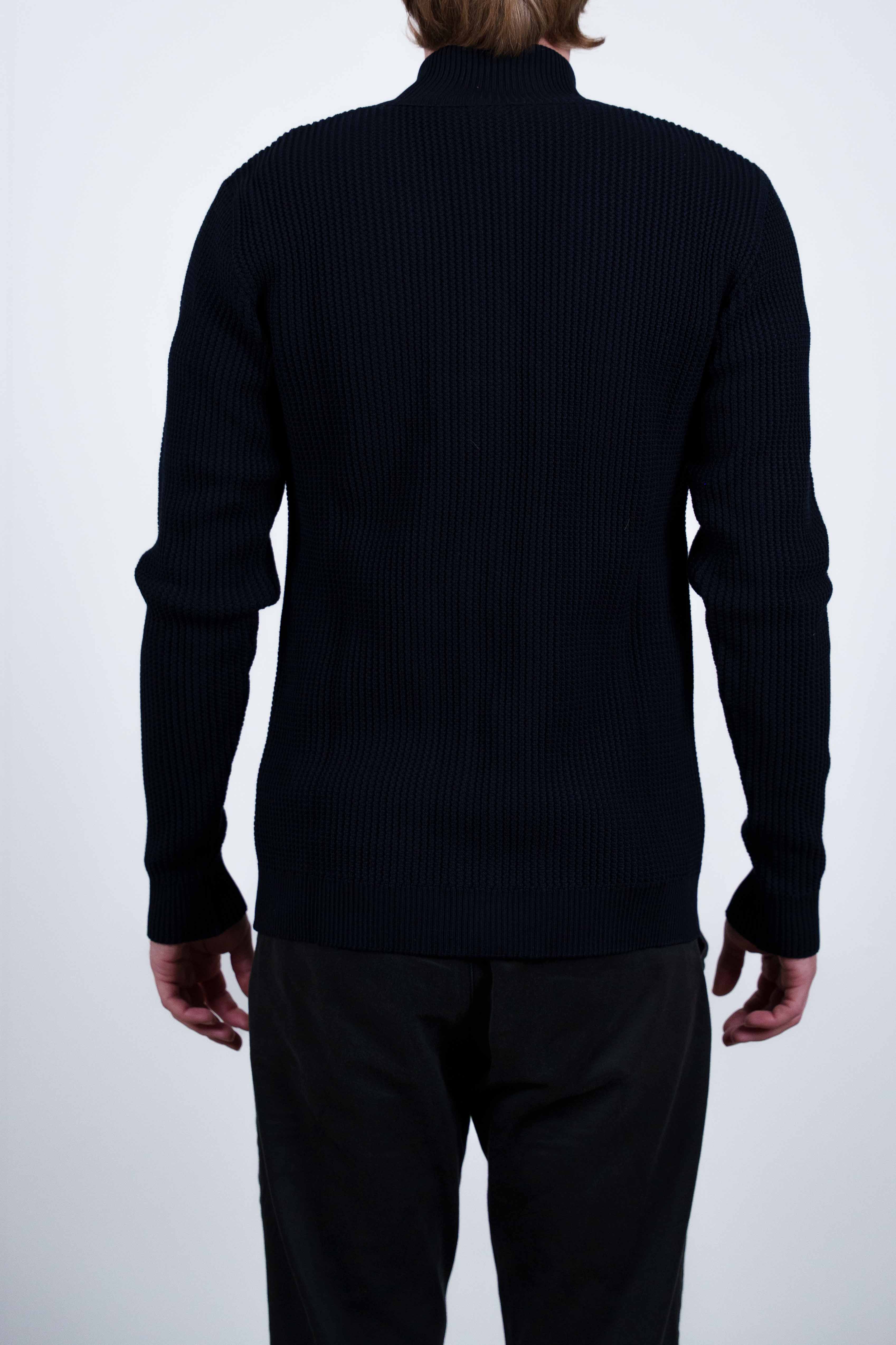 Mørkeblå full-zip sweater fra SS16-kollektionen med høj hals og en markant ribstrikket tekstur. Den har en metallisk lynlås, der løber ned langs fronten og tilføjer en raffineret detalje.
